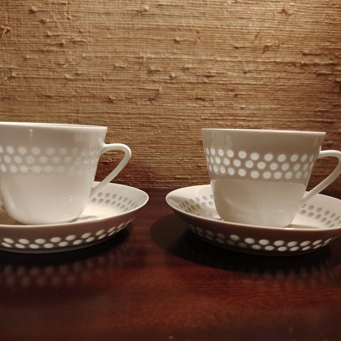Arabia/Rörstrand kuviolliolliset posliinikupit sininsellä värillä, yläosassa tähkäkuviointi. Kupit posliiniä ja niissä on kuvioitu ulkopinta. Sopii käytettäväksi juomien/tee tarjoiluun. Käyttämättömät. 5 kappaletta. Vetoisuus 0,3 l.