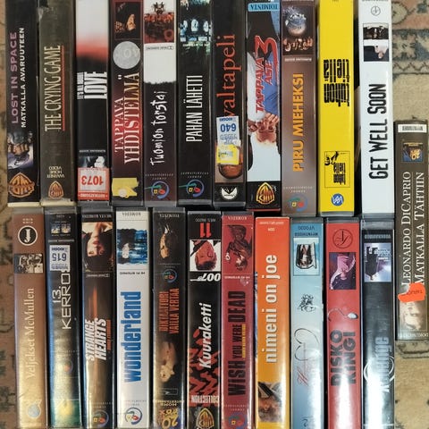 Kaapista toimettomana jollekin, joka harrastaa VHS-elokuvien katselua. Muutaman kerran katsottu ja moitteettomassa kunnossa. Vasen ylhäällä sisältää 2 elokuvaa.
