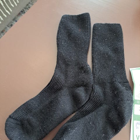Musta villasukat, säilytetty muovipussissa eli koisuojatusti. Vähän pidetty eli ei kulumia, ovat edelleen paksut ja lämpimät sukat. Kokoa en muista. Jalkaterän pituus n. 19cm.