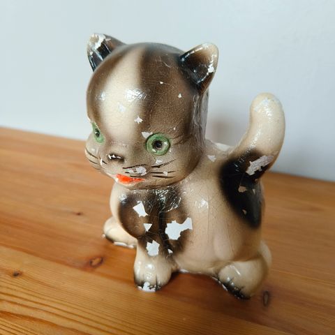 Valkoinen posliininen kissapatsas, jossa on kiiltävä pinta. Pieni koriste-esine, sopii sisustukseen tai keräilyyn.
