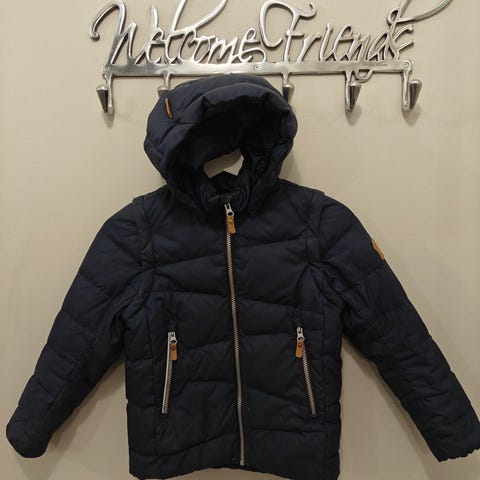 Yhdellä lapsella käytössä ollut todella lämmin puolipitkä talvitakki. Takin väri on hieman kiiltävä harmaa. Takissa on irroitettava huppu.