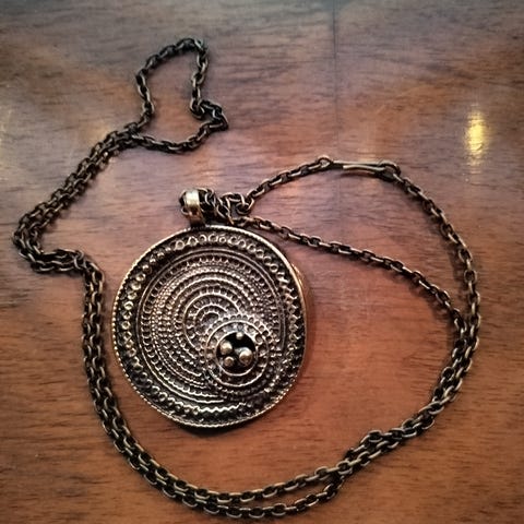 Chic-kaulakoru pronssia, vintage, suunn. Jorma Laine. Korun halkaisija 4 cm, ketjun pituus 70 cm, avattava. Signeerattu. Nouto tai postitus seurantatunnuksella.