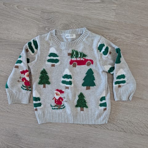 Jouluaiheinen lasten neulepusero koossa 98 cm. Harmaa väri. Valmistettu 100 % akryylistä. Unisex-malli, jossa jouluteemainen kuvio, jossa joulupukki savupiipussa.