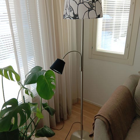 Marimekko unikko kangaspäällysteinen lampunvarjostin ja metallinen pöytälamppu. Korkeus varjostimen kanssa on 54 cm. Oikein hyväkuntoiset.