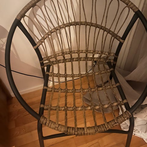 Valkoinen tuoli. Hyvässä kunnossa, mutta pinnassa muutamia pieniä jälkiä, jotka kuvissa näkyy.