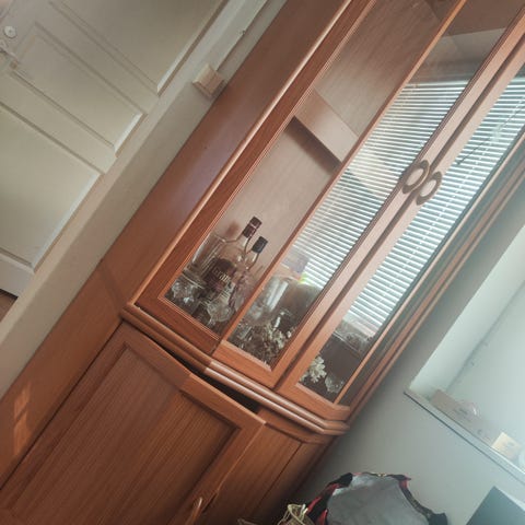 Hyväkuntoinen vitriini uuden tieltä pois. Laatikoiden pohjat vaatinevat muutaman naulan vahvistuksen. Ostettu uutena viisi vuotta sitten.