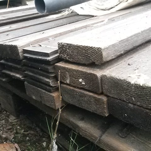 Ulkona piintynyttä lautaa, kaikenlaisia kokoja, tuppilautaakin seiniin, kattoon.