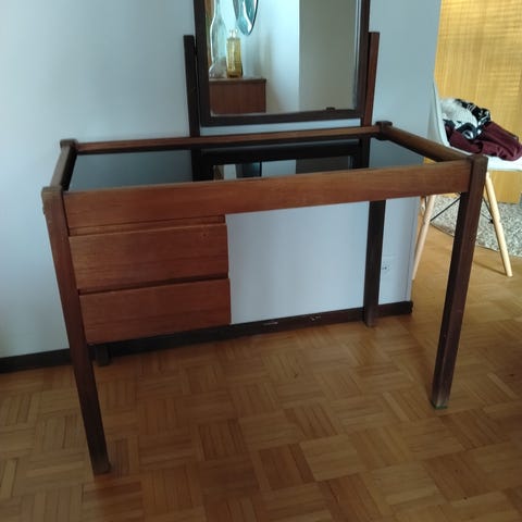 Myydään vanha valkea kampauspöytä. Peilissä ajan patinaa ja kulumaa. Korkeus peilin kanssa 116cm ja ilman 66cm. Leveys 89cm ja syvyys 35cm.