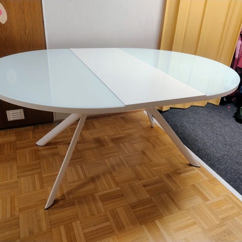 Hyvä ja vankka ruokapöytä. Uuden tieltä jäi ylimääräiseksi. Hieman koirat maistelleet jalkoja ja pöydän reunaa(näistä lisäkuvia mahd saada) Muutamia jälkiä myös pinnassa. Helppo paikata mustalla maalilla