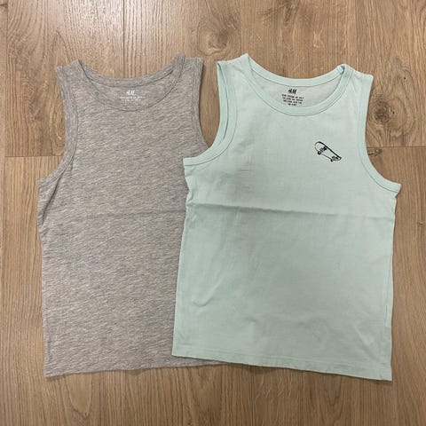2kpl H&M toppeja koko merkintä 122/128cm, sopii mielestäni jo koossa 116cm. Muuten ehjät ja siistit, vaaleansinisessä paidassa on edessä jotain haaleaa tahraa, joka vaikea saada kuvassa näkymään, lähtee mahdollisesti pesussa.