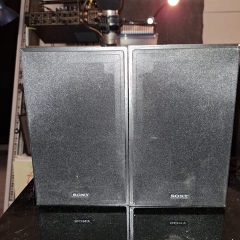 Myydään kuvan mukaiset, upeassa kunnossa olevat kaiuttimet 2 kpl, mustilla telineillä. Laitettu vähän liimaa kaiuttimen pohjaan, mutta saa irroitettua kyllä.