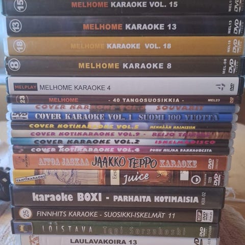17 kpl ammattikäyttöön tarkoitettuja karaokelevyjä (dvd), eli levyjä saa käyttää julkisissa tilaisuuksissa.