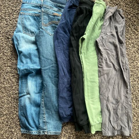 4 kpl collegehousuja koko 128. Housuissa on "pehmeäksi harjattu sisäpuoli". Vyötäröllä kiristysnauhat.