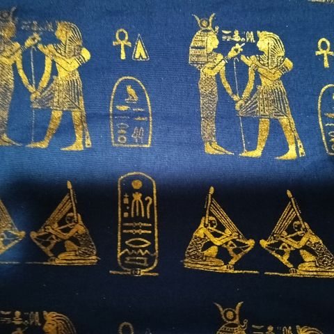 Egyptiläis-tyylinen matto, jossa on beige pohjaväri ja ruskeat kuviot. Maton reunassa on koristeellisia hahmoja ja symboleja, jotka viittaavat egyptiläiseen ja Farao teemaan. Matto, taulut ja patsas sopii sisustukseen,