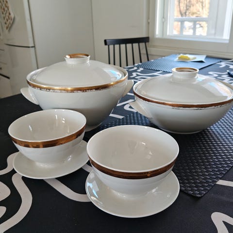 Hyvä kuntoinen ja pinnoitukseltaan ehjä soppakulho. Kullattureuna. Halk. n. 23.5 cm ja korkeus ilman kantta 10 cm. Kulho "soi" kirkkaasti. SAMAAN SARJAAN KUULUVAA ASTIASTOA MYÖS OSTETTAVISSA, HINTA SOVITAAN OSTOJEN MUKAAN.