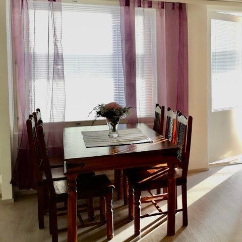 Akaasia/acazia ruokailuryhmä kuudella tuolilla.