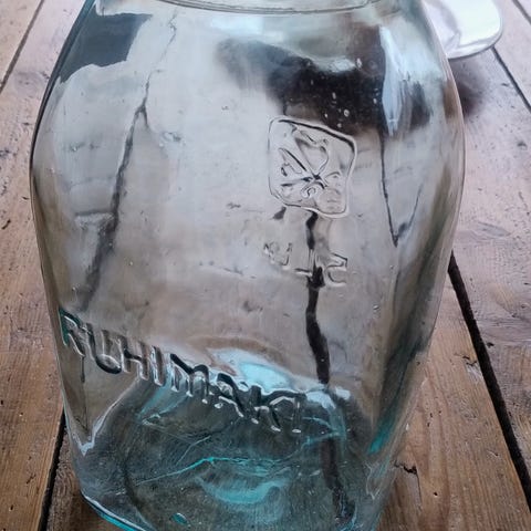 Riihimäen lasi, lasipurkki ruskeasta lasista. Purkissa on kansi ja se soveltuu esimerkiksi säilytykseen tai koristekäyttöön. Materiaali on lasi, väri ruskea. Korkeus 10cm.