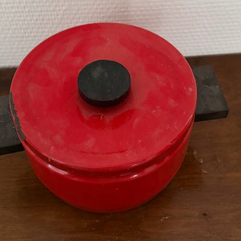 Kuvan mukainen emalikattila. Made in Poland. Kädensijoissa kulumaa. Halkaisija 23 cm ja korkeus 9 cm.