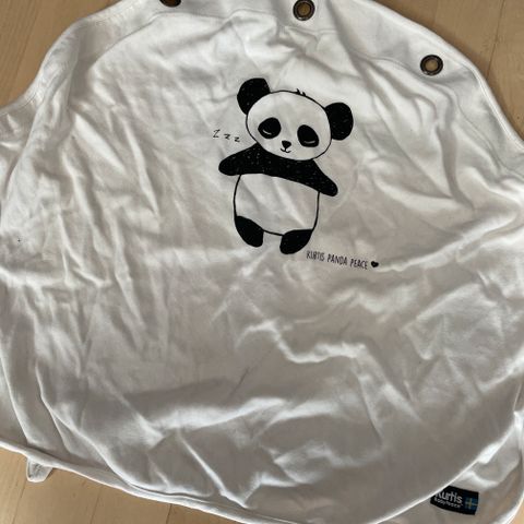 Valkoinen vauvan vaunuverho mustilla pilkuilla. Merkki Kurtis. Mukaan tulee viisi kiinnitysrengasta, kolme ylös, kaksi alas. Ehjä ja siisti.