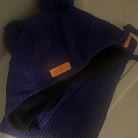 Myydään siisti ja ehjä Gugguun lasten hattu. Koko M. Valmistettu 100% puuvillasta. Pesty käsin ja tupsu irrotettu pesua varten.