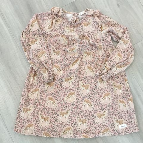 Moitteettomassa kunnossa oleva, ei häpeä uudelle, oleva Newbien vaaleanpunapohjainen bambi mekko. Jemmattu 4 vuotta pikkusiskolle, joka ei kelpuuta mekkoa käyttöön, ehti vanhemmalle neidille vain muutamasti päälle. Meillä olisi hyvä ja sopiva nyt 110cm pitkälle, joten nafti mitoitus.