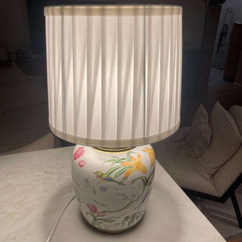 Varjostin PRINTED FACES pöytä- tai lattiavalaisinjalalle. Tulostettu printti pellavakankaalla. halkaisija: 36 cm