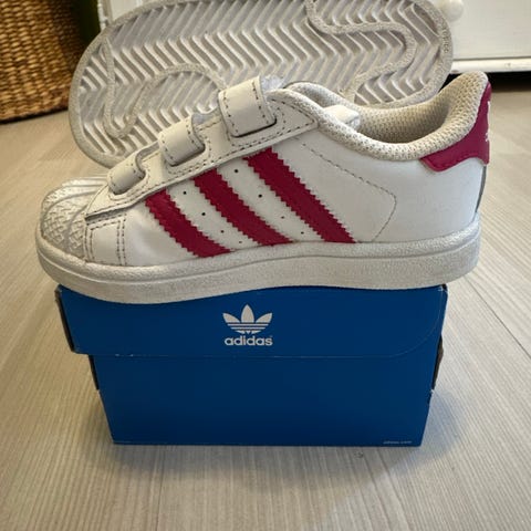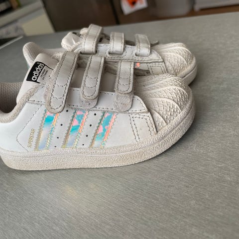 Adidaksen Superstarit tarrakiinnityksellä. Meillä meni 2-2,5-vuotiaalla, jalan koko 23-24.
