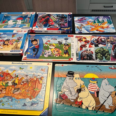 Kokoelma lasten palapelejä, joissa on erilaisia kuvituksia kuten eläimiä, satuhahmoja ja kasvoja. Palapelit ovat valmistettu kartongista ja ovat hyvässä kunnossa.