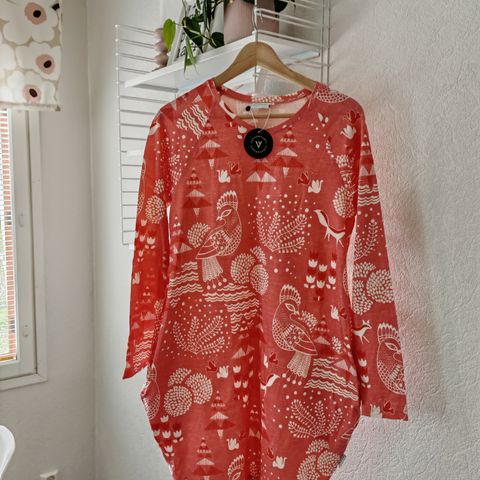 Myynnissä Versonpuodin swinghousut punahattu-kuosilla, koko XL, trikoosta valmistetut culottesit. Leveät lahkeet ovat hieman vajaamittaiset. Vyötäröllä on joustava kuminauha. Molemmilla sivuilla on taskut.