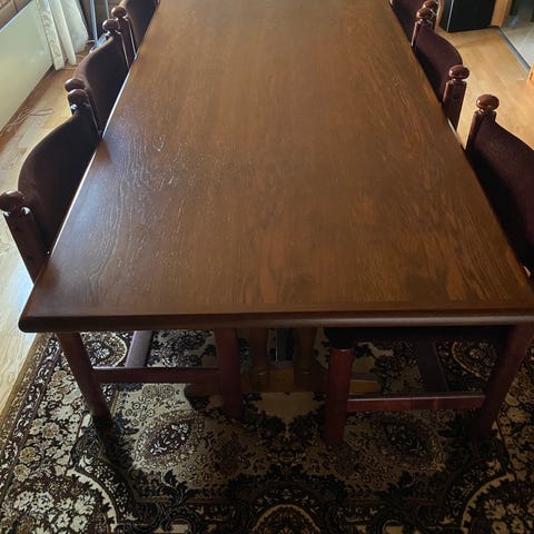 Pöytä tammen värisenä ja esim. mustilla jaloilla. 120-140cm pitkä.