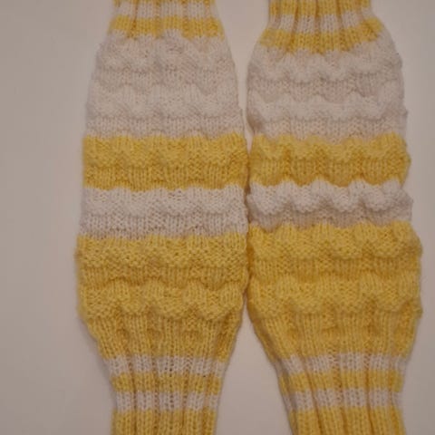 Uudet, ei kokeiltu. Villalangasta, väri viininpunainen ja koristeet harmaa. Yläosassa kuminauha. Leveys 13,5 cm, Pituus 33 cm.