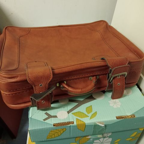 Tekonahkaa. Vintage laukku. Kulumaa löytyy. Remmeissä halkeamia mutta kiinni pysyy. Paljon löytöjä myynnissä kannattaa kurkata ja tarjota hintaa