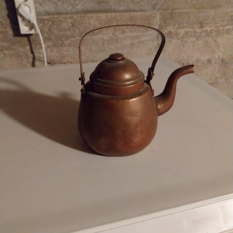 Todella vanha iso kuparipannu, jossa kansi ja kahva. Tilavuus 4 litraa, korkeus noin 20 cm. Mielestäni vaikuttaa kyläsepän tekemältä. Käytön jälkiä, rosoisuutta ja patinaa, yksi isompi lommo. Sopii koriste-esineeksi.