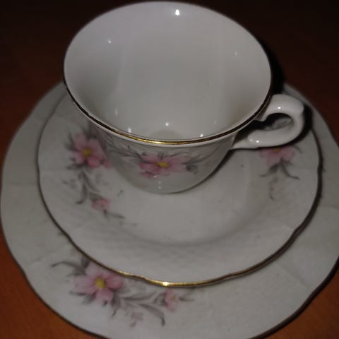 Kauniit lasiset kukkakuvioiset asetit (2kpl) ja pullalautaset (4 kpl)