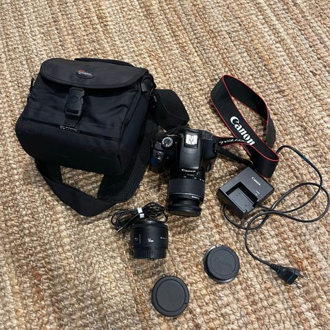 Canon EOS 1100D runko, rikkinäinen 18-55mm putki ja laukku