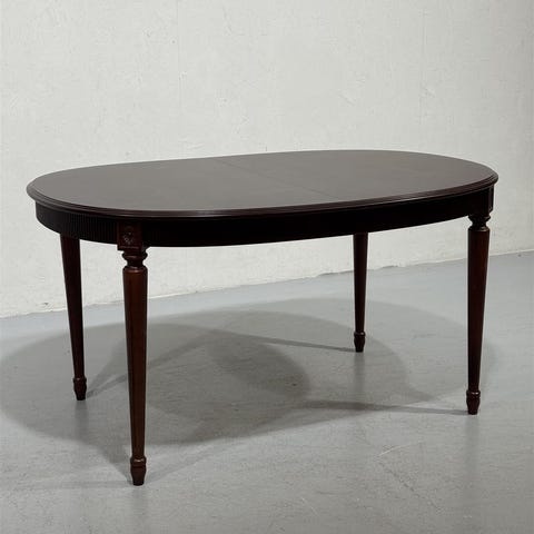 Kaunis täyspuinen ruokapöytä ø 110cm, keskelle kaksi 40cm jatkopalaa, jotka mahtuvat kätevästi pöydän alle, liukumekanismi toimii moitteetta. Kustavilainen. Vain nouto ja käteismaksu.