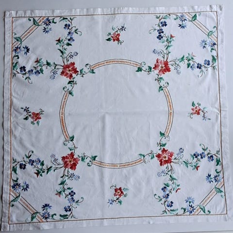 Punaviinimarja-aiheinen pöytäliina, jossa valkoinen pohjaväri ja vihreä sekä roosa pensasmarjakuvio/köynnöskuvio. Pöytäliina on valmistettu paksusta kankaasta, joka on joko puuvillaa tai sekoitetta, jossa mahdollisesti pellavaa, koska tuntuma on karheampi. Voi johtua myös kudontatavasta ja langanpaksuudesta yms.