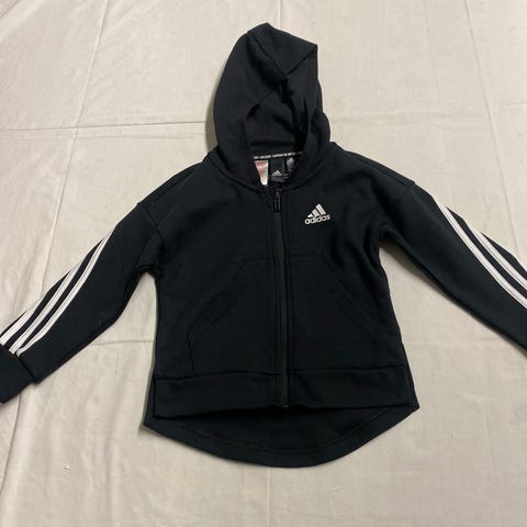 Adidas lasten huppari, koko 110, unisex. Väri musta, valkoiset raidat hihoissa. Hupparissa vetoketju ja huppu. Edessä ja takana Adidas-logo ja -tekstit.