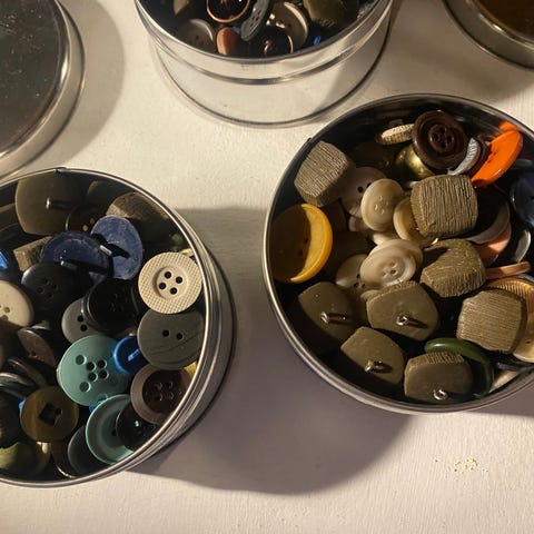 Metallia oleva rasia kannella ja sisällä olevat punaiset satiininauhat, tarranauhat. Osassa näistä liimanauha, verhon lyhennykseen nauhat, metalliketju. Kaikkien hinta yhteensä 5€. Rasian koko on 29x23. Korkeus on 7cm.