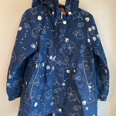 Reimatec-takki, jossa neppareilla kiinnitettävä turvahuppu, säädettävä helma ja heijastavat yksityiskohdat. Kangas on melko tukevaa, joten hylkii tuulta ja myös pientä sadetta.