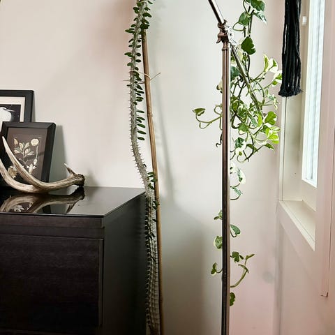 Huonekasvi, jossa korkea varsi ja kapeat vihreät lehdet. Hopeanvärisessä ruukussa. Korkein kohta n.160cm