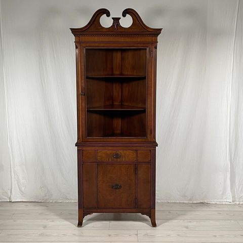Hyvin yksityiskohtainen ja harvinainen tanskalainen kulmakaappi. Hyvässä kunnossa, hieman naarmuja kaapin alaosassa. Korkeus 210 cm, leveys ja syvyys 41,5 cm. Toimiva valo ja irroitettavat lasilevyt. Tekijä on ilmeisesti Aksel Harboe, mutta kaapista ei löydy leimoja tmv. Kaappi on täysin samanlainen kuin nämä: