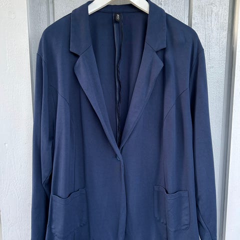 Lyhyt vuorillinen sinertävän harmaa jakku/ bleiseri, ostettu Lissabonin Zarasta viime joulukuussa. Pari kertaa käytetty. Koko XL, mitat olka-helma 54 cm, helma venyttämättä (edestä) 58 cm, hiha 58 cm. Hihansuissa ja helmassa kuminauha. Edessä taskut, kullanvärinen pitkä vetoketju ja huppu. Kangas on kauniisti laskeutuvaa polyesteri/elastaania. Nouto/ toridiili.