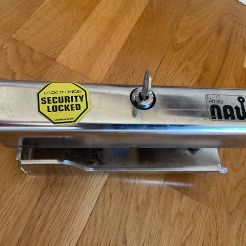 Kestävä moottorin kiinnikkeisiin kiinnitettävä lukko. Haponkestävää ruostumatonta terästä. Ruuvikiinnikkeiden välin enimmäismitta: 220 mm. Mukana 2 avainta. Mitat: 300 x 40 x 38 mm.