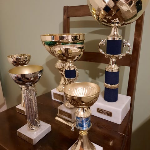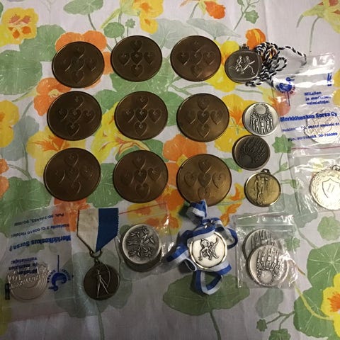 Kuvan palkintomitalit ja -pokaalit ym, näitä on kymmeniä vuosien saatossa tulleita. Kaikkia ei kuvattu, laatikollinen ja muovipussillinen. Tarjoa yhteishintaa!