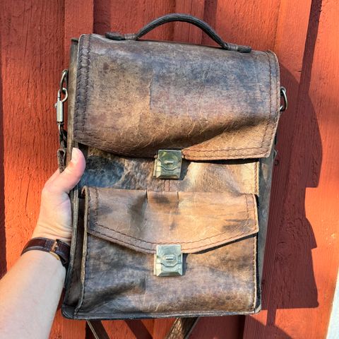 Vanhahko nahkalaukku vetoketjulla. Laukussa on mukavasti tilaa; kaksi lokeroa ja molemmissa lisäksi pienet vetoketjutaskut. Mitat: pit. n.28cm, kork. n.18cm ja lev. n. 7cm.