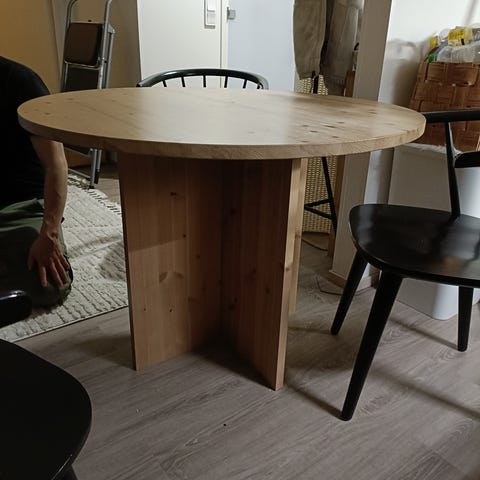 Pyöreä valkoinen puinen ruokapöytä ja tuolit
