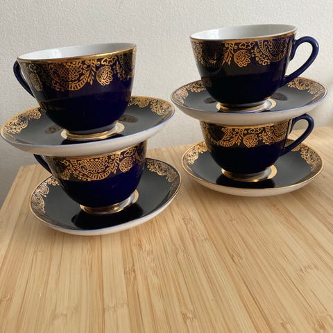 Neljä hyväkuntoista Lomon Golden Garden sarjan kahvikuppia, niille aluslautaset ja pullalautaset. Pullalautasissa pientä kulumaa kultauksissa, ilmeisesti aluslautasten hankaumaa. Kuppien vetoisuus 1,5 dl.