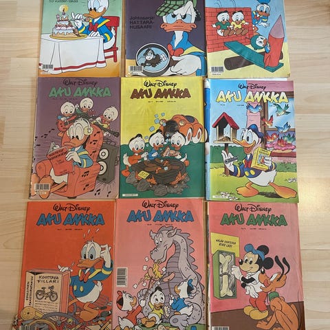 Myydään kuvan hyväkuntoiset Aku ankka lehdet . Myydään myös erikseen 0,5e/kpl. Nouto mieluiten Tampere tai Kaarina.