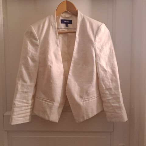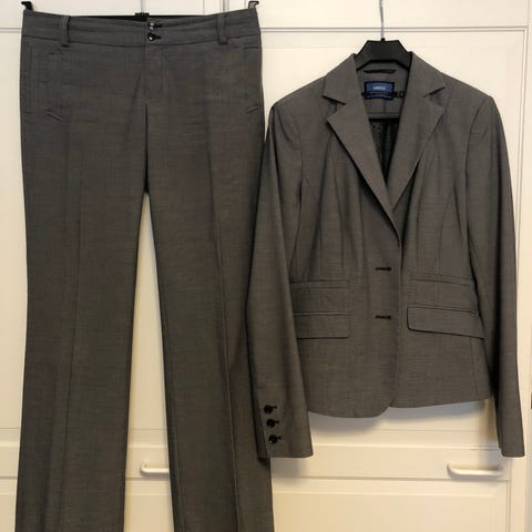 Erittäin siisti, kaunis, hoikkalinjainen Mexxin housupuku (bleiseri ja housut). Housut herrainhousu -tyyliset leveähköt lahkeet. Itsellä ollut käytössä edustustilaisuuksissa. Harmikseni olen kasvanut tästä ulos 😉